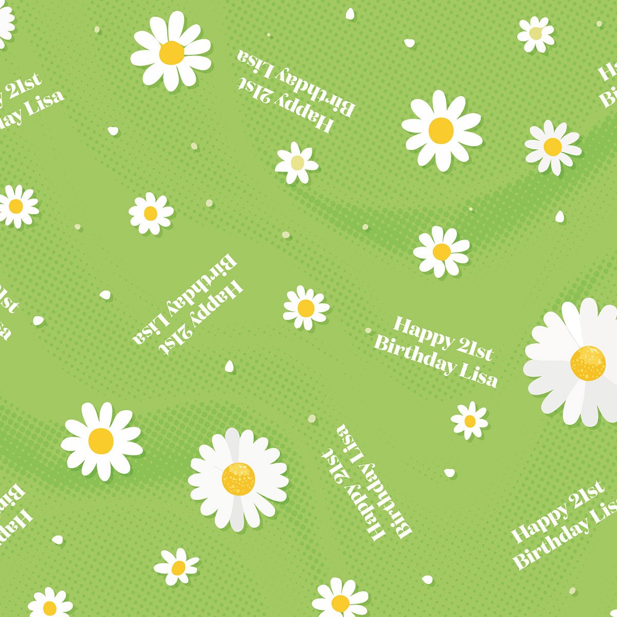Brighten up any gift with our cheerful daisy wrapping paper. Featuring beautiful white daisies with golden yellow centres scattered across a fresh green background with a subtle halftone texture, this joyful design is guaranteed to bring a smile.