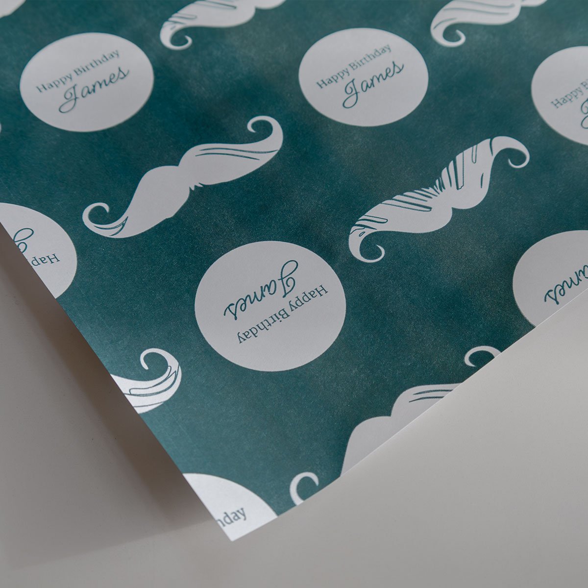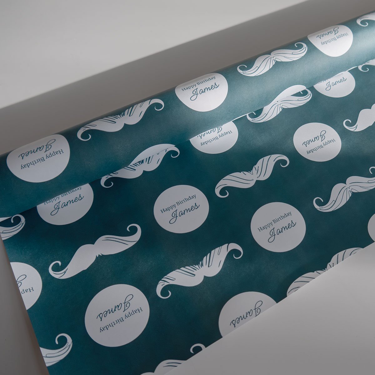 Make their birthday extra special with our fun personalised moustache wrapping paper. This playful design features a stylish handlebar moustache pattern on a bold background, with your custom message printed throughout.